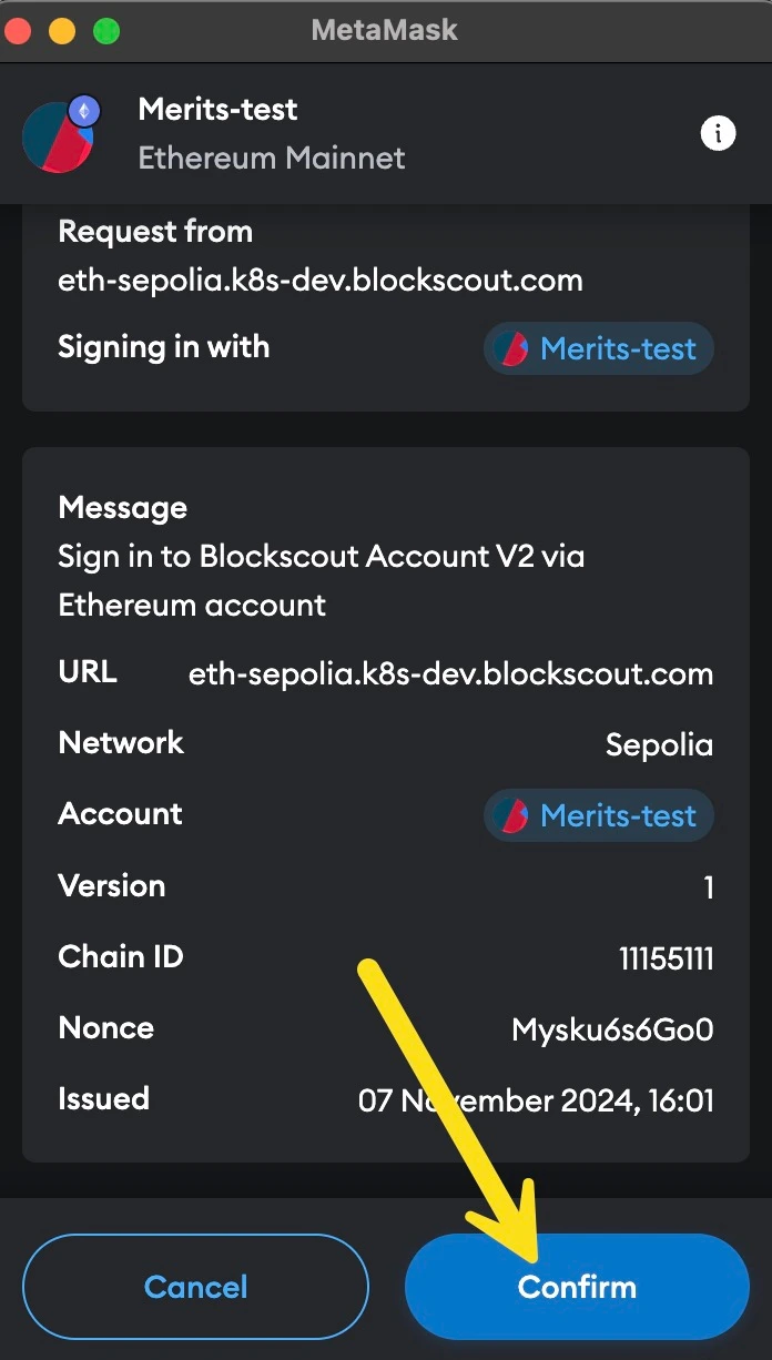 Once you have granted permission to connect your wallet, you can login to your account. When confirming in your web3 wallet be sure to check that the site info and wallet info are correct (in this example we are using a testnet, so the information will be different depending on the instance you are accessing).